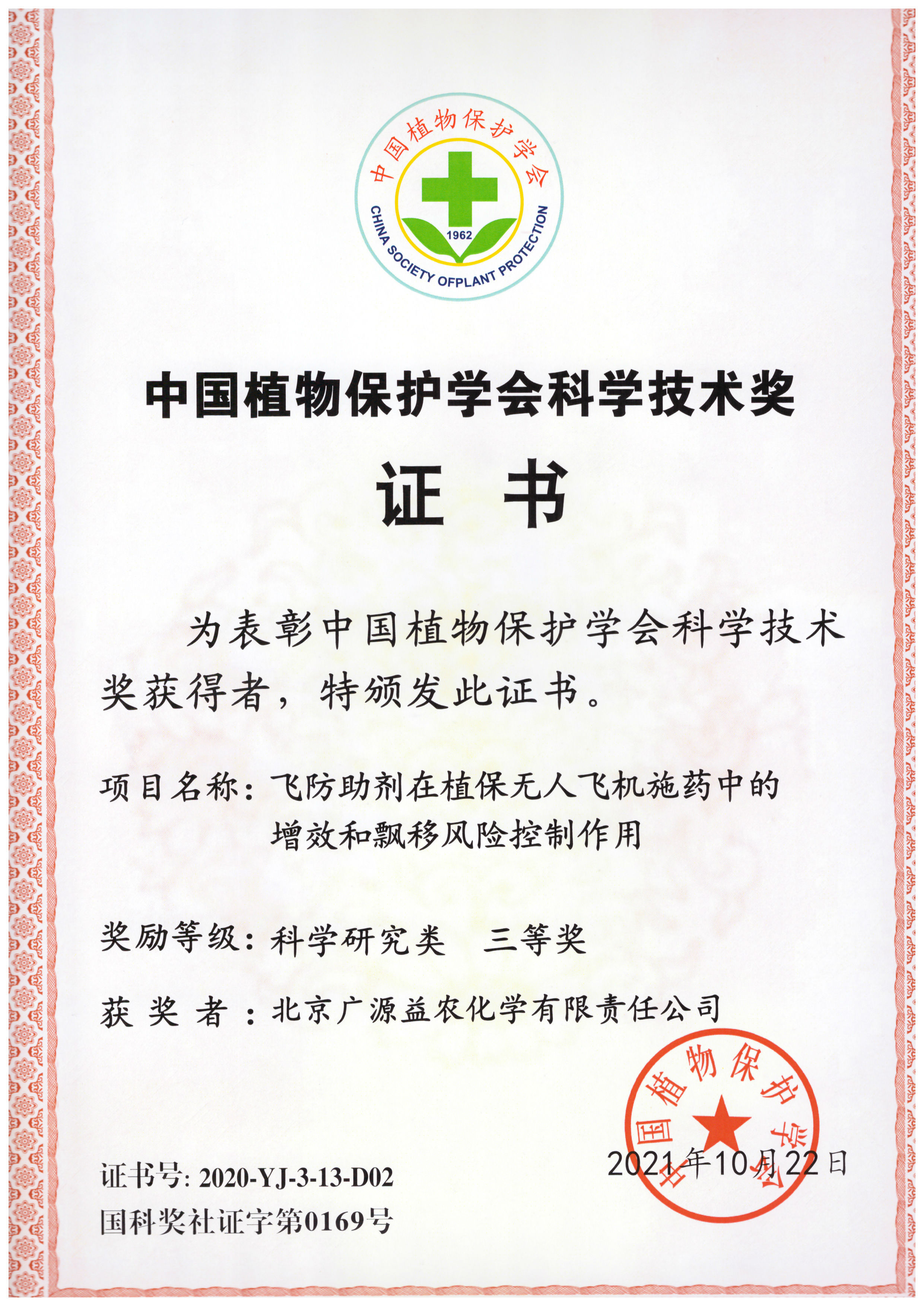 热烈祝贺我公司荣获中国植物保护学会科学技术奖三等奖